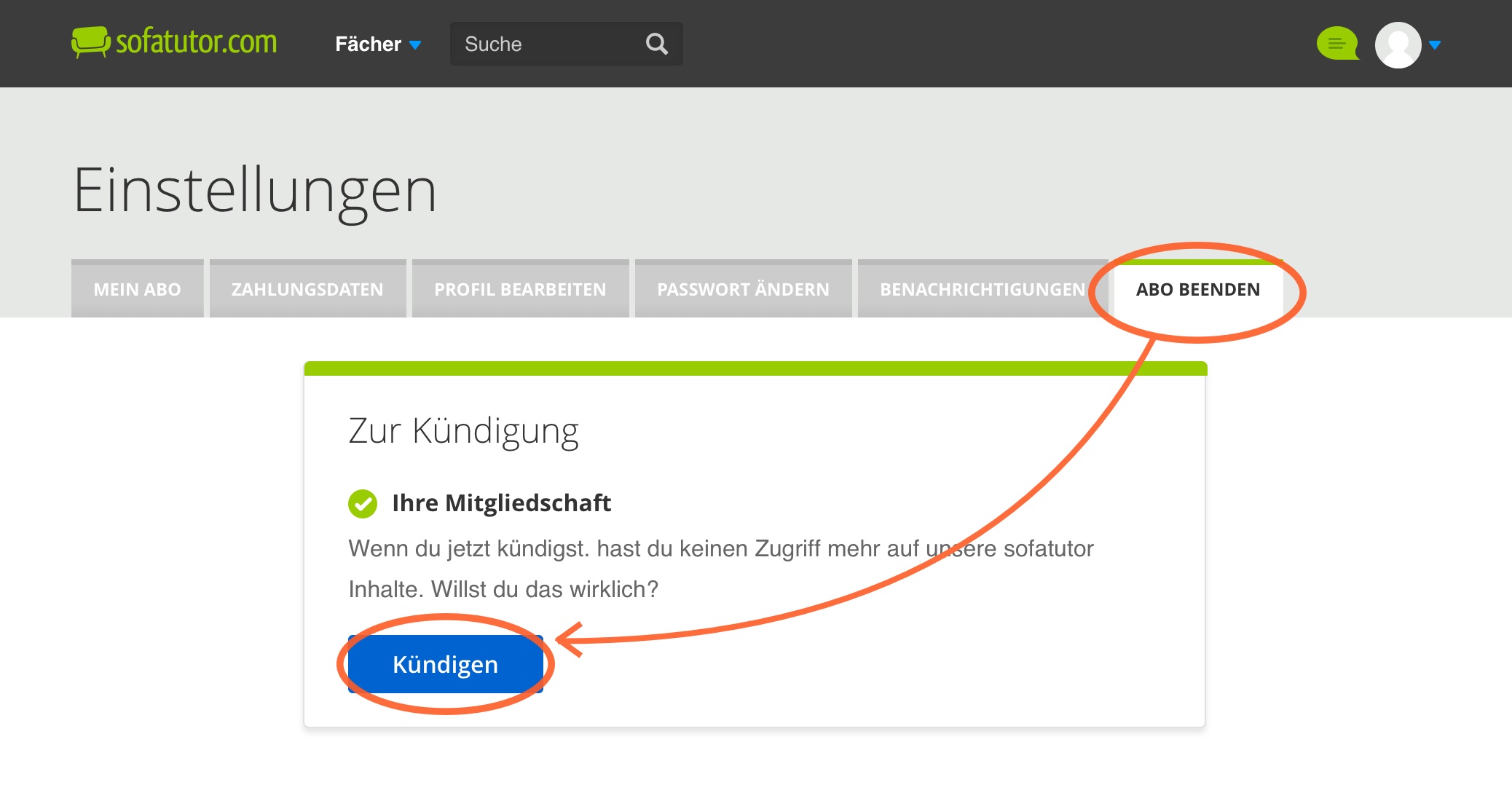 Unsere Abos verlängern sich nach Laufzeitende um die eigene Laufzeit zum unrabattierten Preis. Wenn Sie sofatutor nicht mehr nutzen möchten, so genügt die rechtzeitige Kündigung in Textform (z. B. per Brief, Fax oder E-Mail). Im 6- und 12-Monats-Abo haben Sie hierzu bis 14 Tage vor Laufzeitende Zeit.